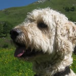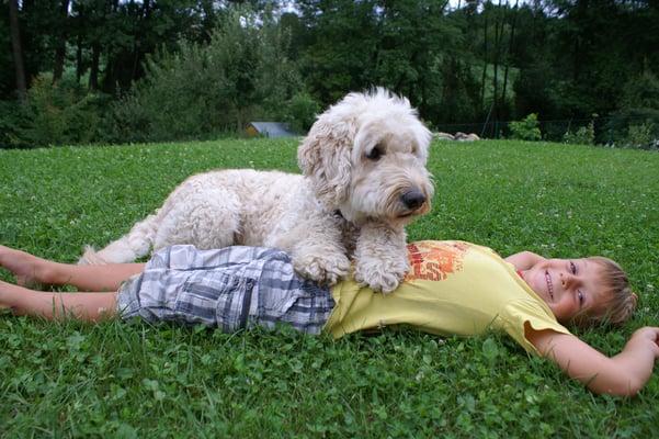 Das ist Scooby ein Goldendoodle (Mix aus Golden Retriever und Königspudel).